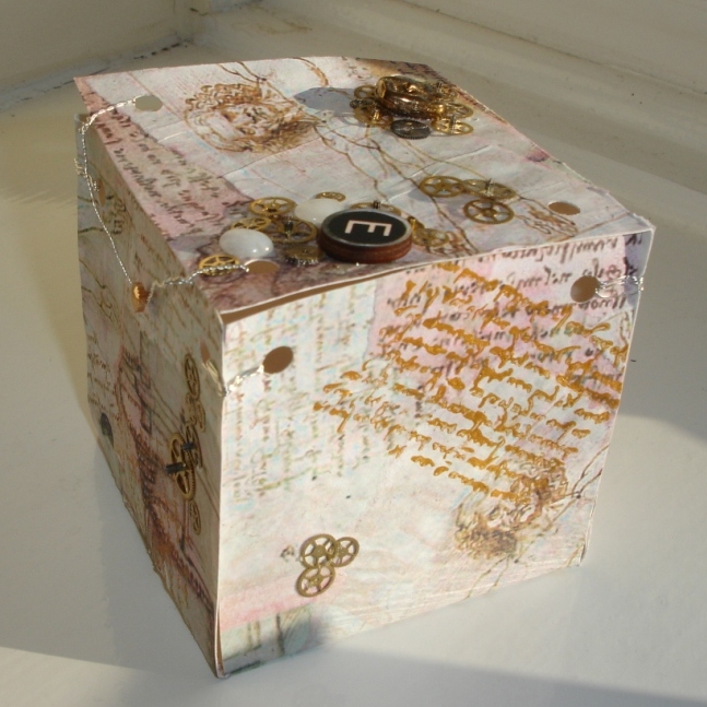 To decorate your box collect together appropriate pieces of paper. They could be scraps of tissue paper, wrapping paper (for a Christmas themed box) or images printed from the internet (non-copywrited ones of course). For my box I have printed out some Leonardo Di Vinci drawings to go with my steampunk theme.